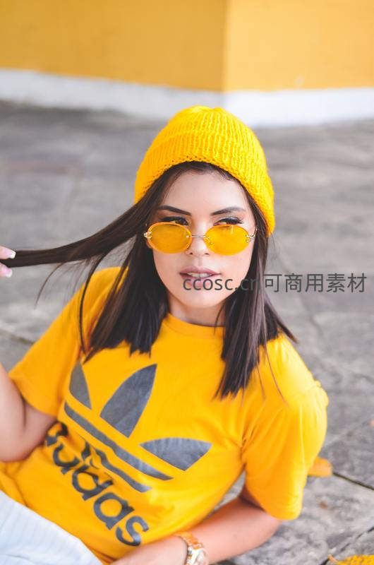 身穿亮黄色Adidas T恤和同色系针织帽的少女,在阳光明媚的户外街角摆拍,手拨秀发,展现出青春、活力与时尚感。