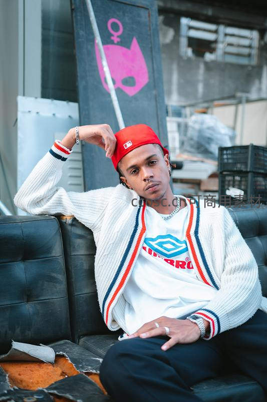 一位年轻男子头戴红色棒球帽,身穿条纹开衫与Umbro T恤,慵懒地倚靠在破旧沙发上,背景涂鸦墙增添浓厚街头文化气息。