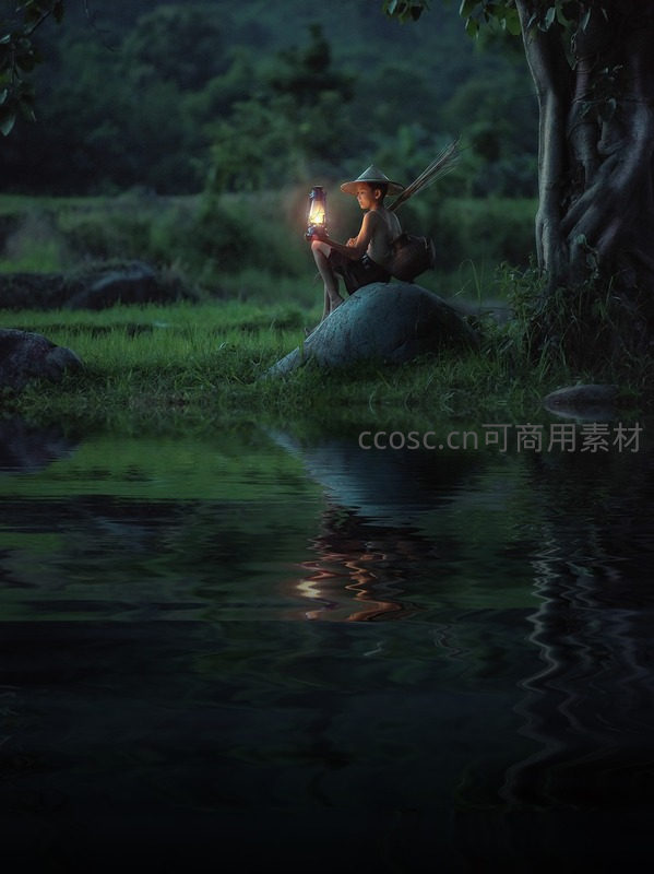 一位戴着斗笠的少年坐在溪边岩石上,手提一盏暖黄的灯笼,水面倒映着灯光与树影,营造出宁静而温暖的夜晚氛围。