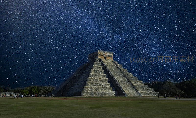 古老的玛雅金字塔在满天繁星与银河的照耀下显得庄严而神秘,现代游客的身影衬托出人类文明与宇宙时空的对话。