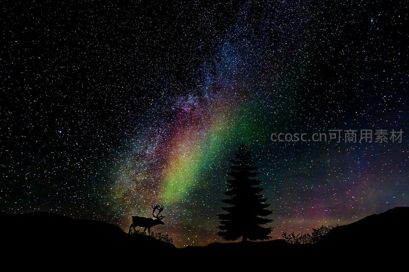 绚烂极光划破夜空,驯鹿与松树的剪影静静伫立,营造出梦幻般的北国童话景象,充满自然魔力。