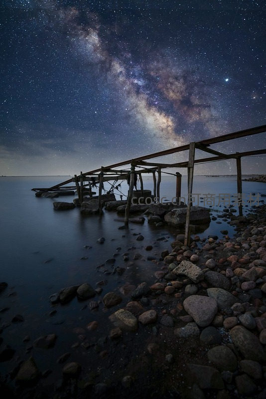 浩瀚银河垂落海天之际,破旧木制码头延伸入海,岸边礁石错落,如时光凝固的静谧画卷。