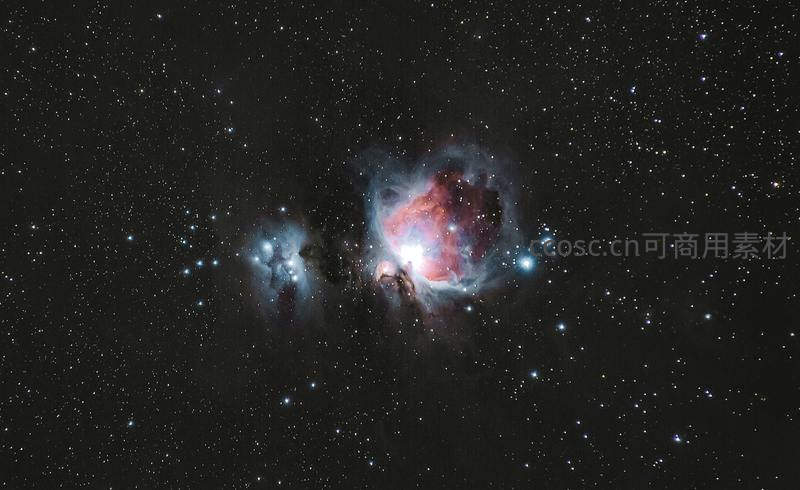 猎户座星云核心区域色彩斑斓,炽热的红色与冷艳的蓝色交织,周围星点密布,仿佛宇宙深处一幅流动的抽象画卷。