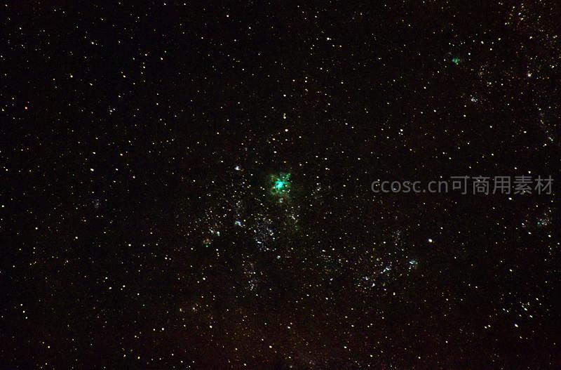 一片罕见的绿色星云在无垠星海中静静发光,其独特的色调与周围的暗物质和点点繁星形成鲜明对比,散发着奇幻而神秘的气息。
