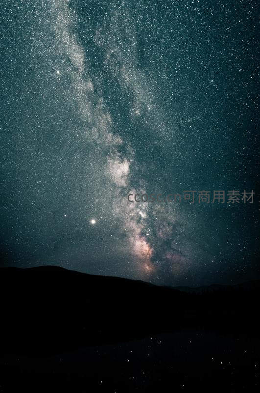 银河斜挂于寂静山峦之巅,下方湖面如镜,隐约倒映着点点星光,营造出天地对称的静谧美感。