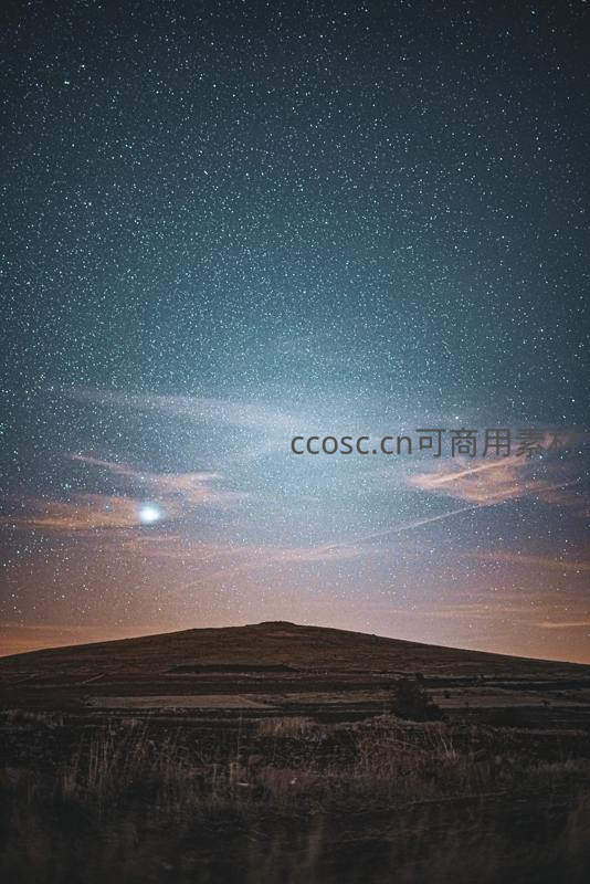 一轮明月悬于星海,柔和的光辉洒在起伏的丘陵上,薄云如纱飘过,为这片静谧的夜空增添了一丝梦幻与诗意。