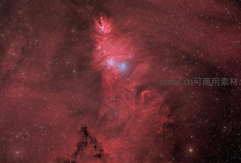 炽热的红色星云如火焰般翻腾,中心区域透出清冷的蓝色光芒,展现宇宙中恒星诞生区的激烈与美丽。