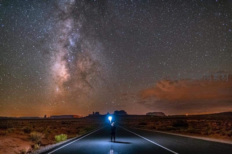 一人持手电站在空旷公路上,光束照亮前路,头顶银河倾泻而下,天地间唯余寂静与壮美。