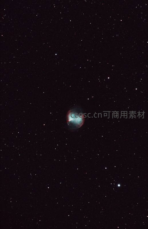 一个色彩斑斓的行星状星云悬浮于漆黑的宇宙背景中,其边缘泛着红光,中心透出幽蓝,宛如宇宙深处的一颗宝石。