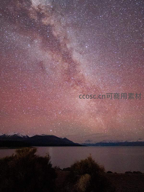 粉紫色的银河如丝带般划过夜空,下方是平静的湖面和连绵的雪山,构成一幅梦幻而宁静的自然夜景图。