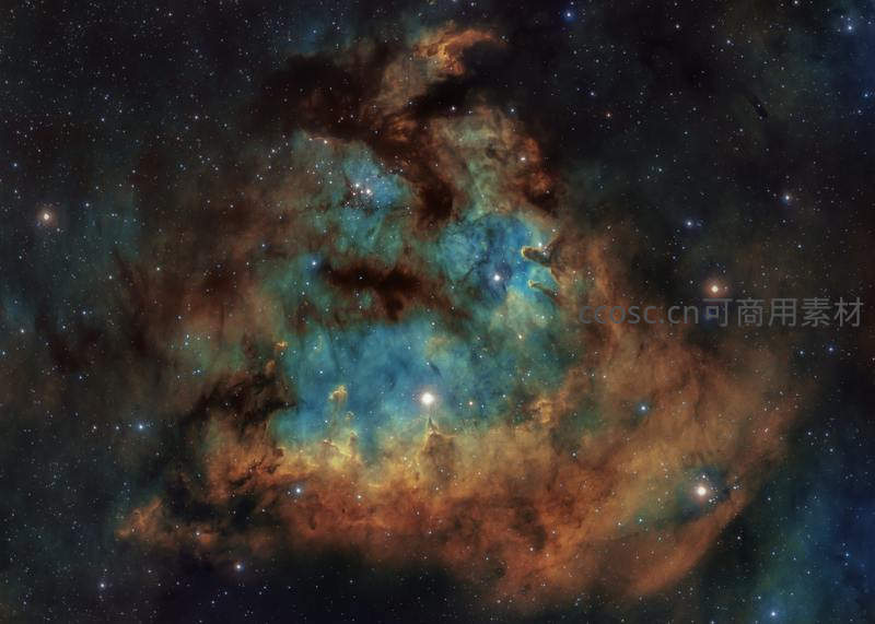 绚丽的蓝橙色星云在黑暗宇宙中绽放,如同艺术家打翻的调色盘,展现宇宙的瑰丽与奇幻。