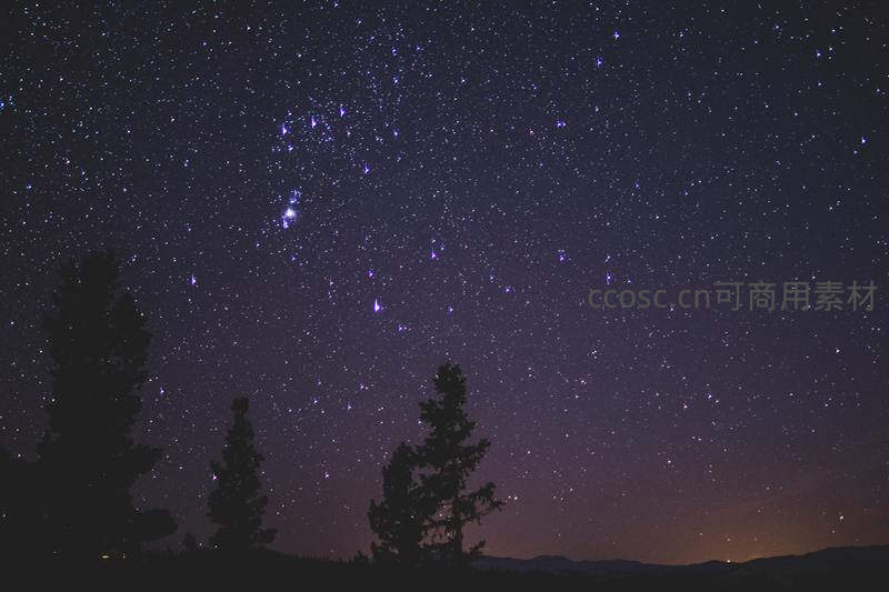 几棵松树的黑色剪影静立于大地,背景是缀满星辰的深紫色夜空,远处山峦隐约,氛围宁静致远。
