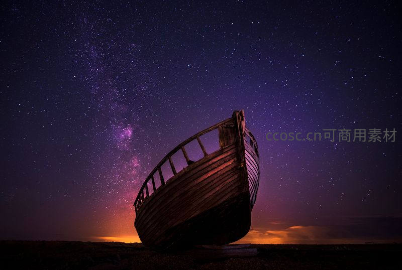 一艘被遗弃的木船在星光下静卧于荒芜之地,头顶是绚烂的紫色银河,仿佛在无声地讲述着一段被遗忘的航海故事。