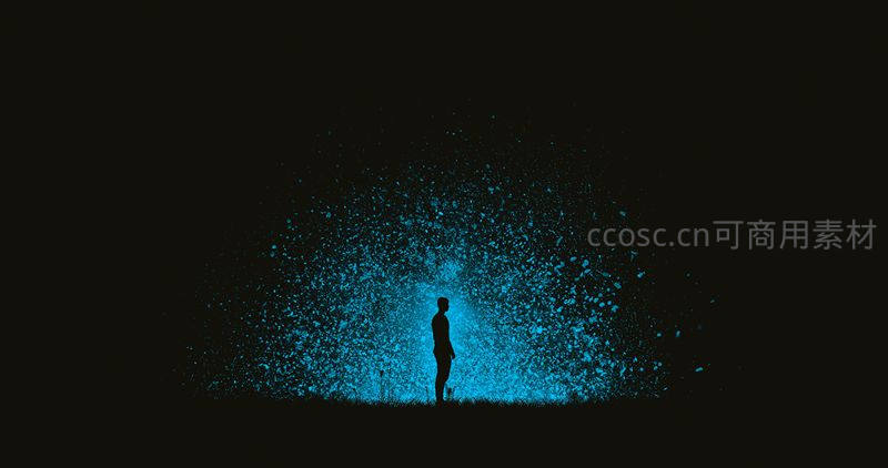一个人形剪影伫立在黑暗中,周身环绕着如星尘般闪烁的蓝色发光粒子,营造出一种超现实、充满未来感的梦幻氛围。