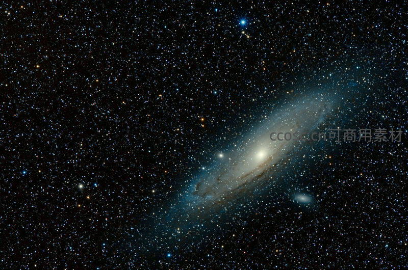 一个巨大的螺旋星系斜穿画面,蓝色旋臂与金色核心交相辉映,尽显宇宙结构的宏伟与精密。