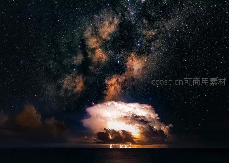 海上雷暴云剧烈翻滚,闪电撕裂黑暗,头顶银河如幕布垂落,天地间上演自然奇观。