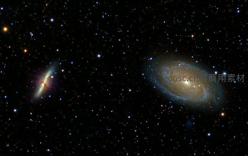 浩瀚夜空中,两个宏伟的螺旋星系遥相呼应,一个侧立,一个正对,它们的旋臂在黑暗背景中闪耀着金色与蓝色的光辉。