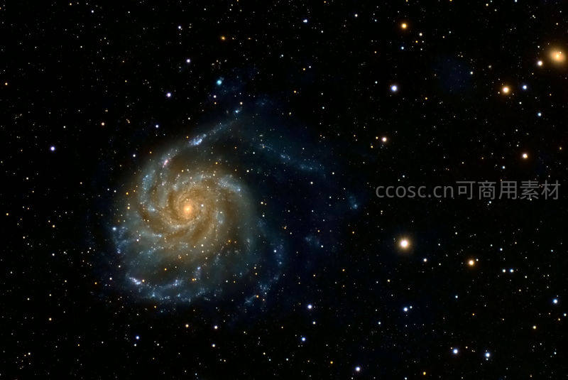一个完美的旋涡星系悬浮于漆黑的宇宙背景中,其明亮的金色核心与蓝色旋臂清晰可见,周围繁星点点,尽显宇宙之美。