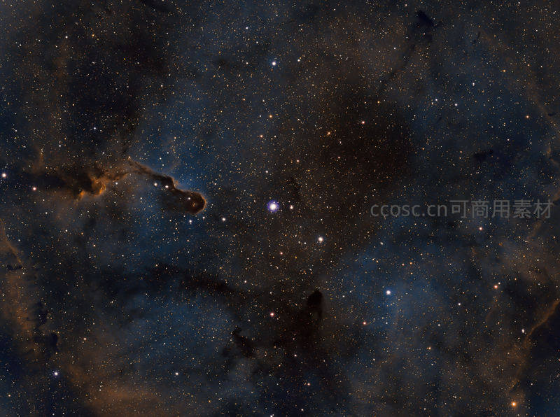 幽蓝与橙黄交织的星云中,巨大的暗分子云如剪影般矗立,被周围新生恒星的光芒照亮,构成一幅宇宙画卷。