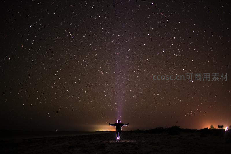 一人张开双臂站立沙丘之上,脚下微光映衬,仿佛拥抱无垠星空,传递自由与敬畏之情。