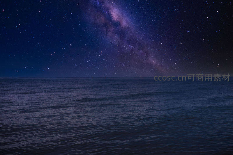 深邃夜空中银河如带横贯天际,海面微波荡漾倒映星光,营造出宇宙与海洋交融的静谧壮丽景象。