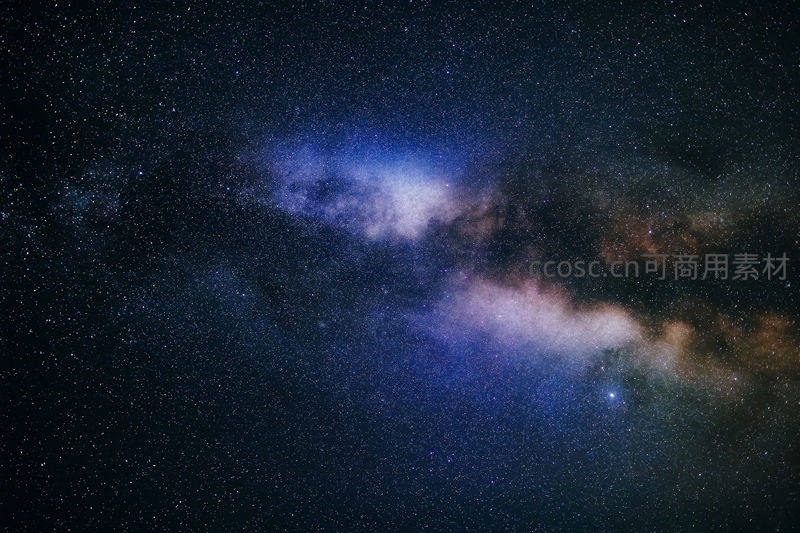 银河云气如薄纱般缠绕,蓝紫与暗褐交织,星光若隐若现,营造出深邃宇宙中既美丽又神秘的氛围。