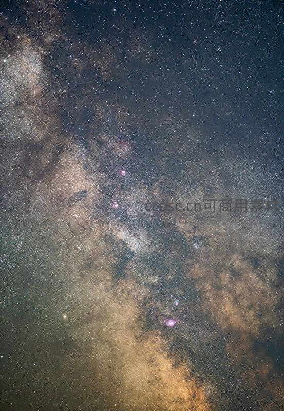 聚焦于银河核心区域,密集的星光与斑斓的色彩交织,金色与蓝色的光斑在星际尘埃中若隐若现,展现出宇宙的壮丽画卷。