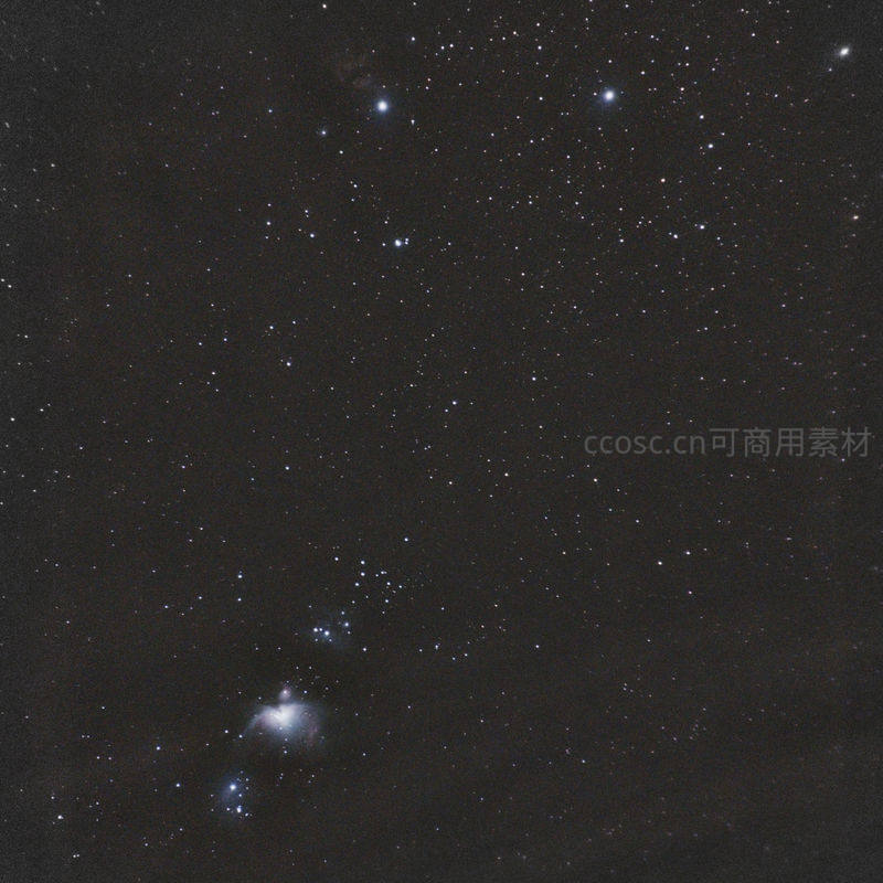猎户座星云在深邃的夜空中清晰呈现,其柔和的白色光芒被周围密集的蓝色恒星所环绕,是天文爱好者观测的经典目标。