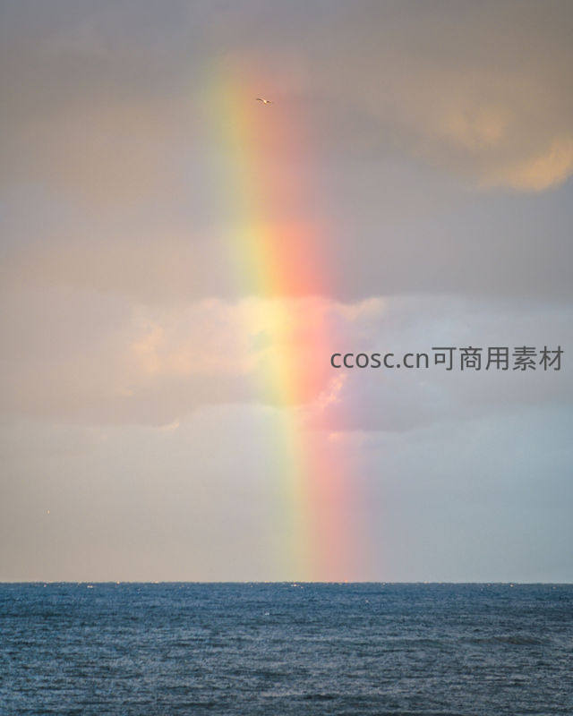 一道完整的彩虹从云层垂落至海平面,色彩斑斓,与辽阔海天融为一体,一只飞鸟掠过,增添诗意与生机。