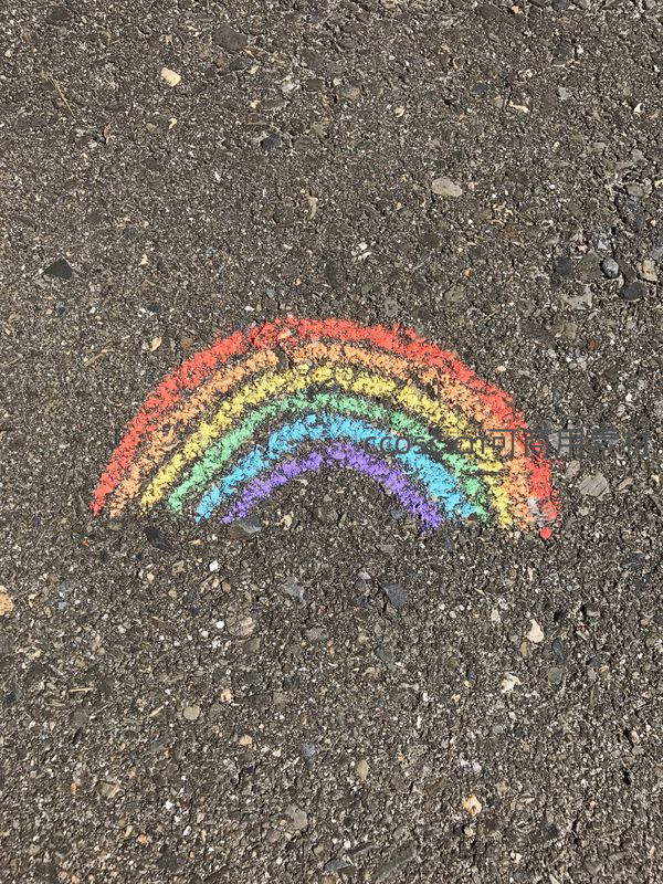 在深色的柏油路面上,用彩色粉笔绘制了一道完整的彩虹,色彩鲜艳,充满童趣与生活气息。
