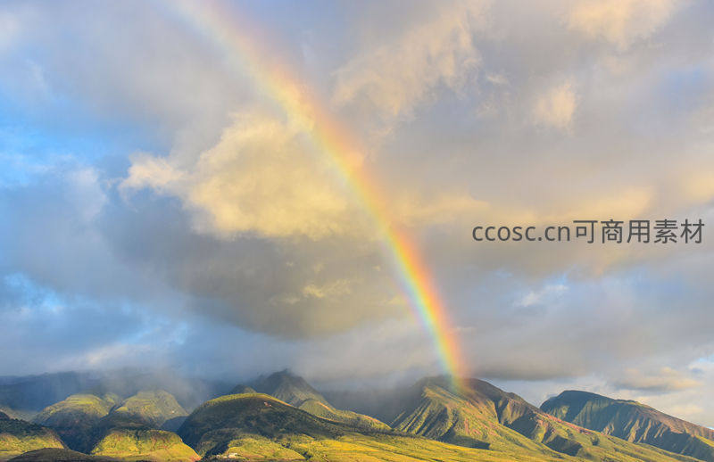 雨后初霁,一道彩虹优雅地跨越连绵起伏的绿色山丘,云层流动,阳光洒落,景象如诗如画。
