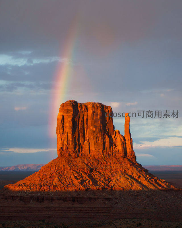夕阳余晖照亮红色砂岩巨塔,身后隐约浮现出一道柔美的彩虹,为苍茫沙漠增添一抹奇幻色彩。