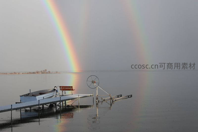 平静湖面上双彩虹清晰倒映,木质码头延伸入水,小船静泊一旁,整个画面如诗如画般宁静。