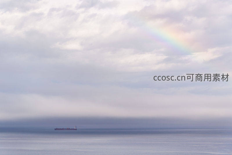 海平线上彩虹与远方货轮