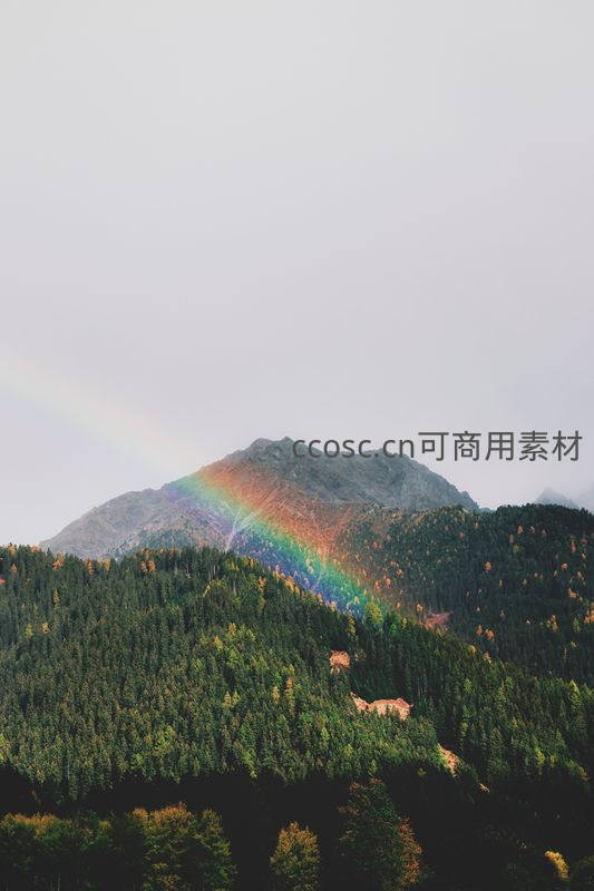 彩虹如桥般架在覆盖着绿林与秋叶的山巅之上,云层低垂,营造出童话般的静谧山野氛围。