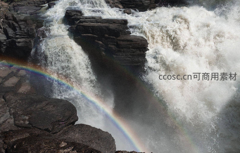 湍急的水流撞击嶙峋巨石,激起漫天水雾,一道鲜艳的彩虹在浪花中若隐若现,展现了自然力量与色彩的完美结合。