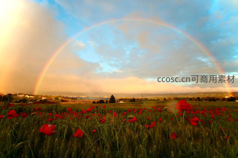 火红的罂粟花海铺展于大地,天空中一道完美彩虹如拱桥般横跨,夕阳霞光为其镀上金边,营造出浪漫唯美的田园诗境。