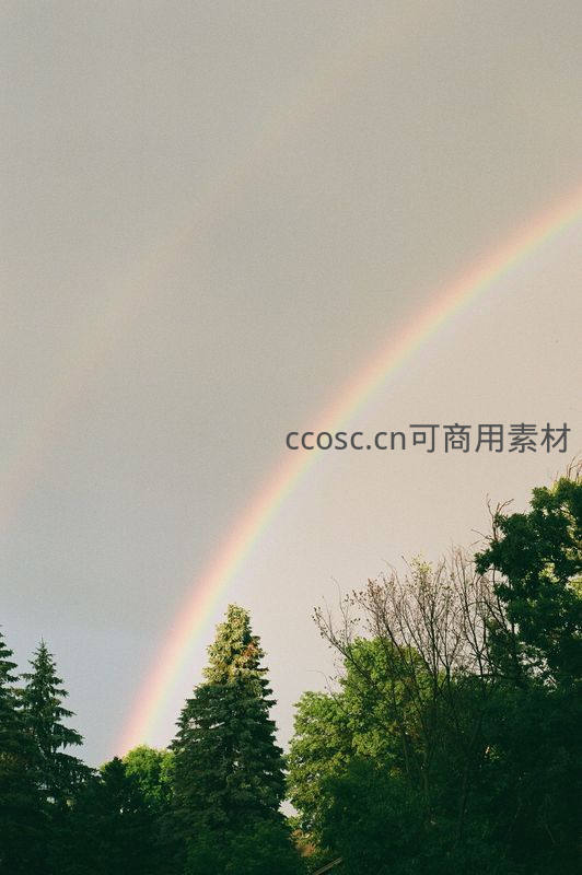 雨后初晴,两道彩虹悬于苍穹,与郁郁葱葱的树林相映成趣,空气清新,充满宁静祥和的自然气息。