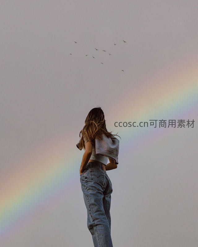 女子仰望彩虹,群鸟飞过暮色天际