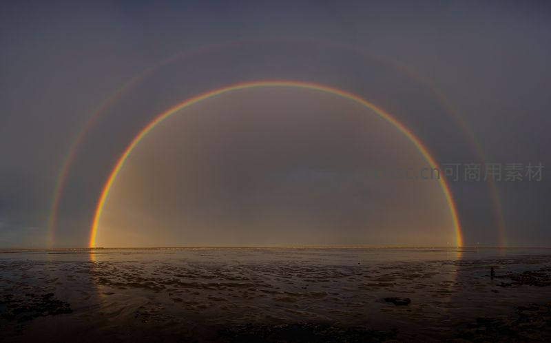 海滩上空完美的双彩虹弧线