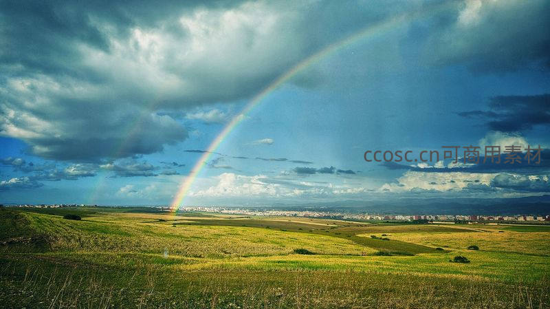 雨后草原上空出现壮丽双彩虹,远处城市轮廓在云层下若隐若现,天地间色彩斑斓,宁静而震撼。