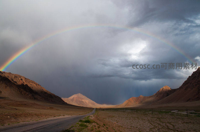 一条蜿蜒公路穿过干旱山谷,暴雨云层下悬挂着完整的彩虹,为苍凉地貌注入希望与生机的视觉冲击。