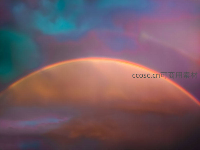 在紫蓝色调的迷离云层中,一道柔和的彩虹若隐若现,营造出如梦似幻、充满艺术感的抽象视觉体验。