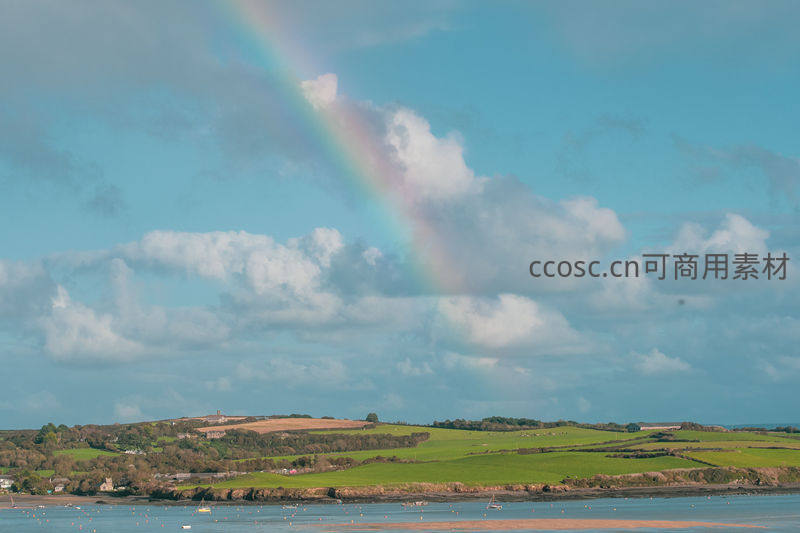 田园上空的单虹,连接碧海与绿野的彩色桥梁