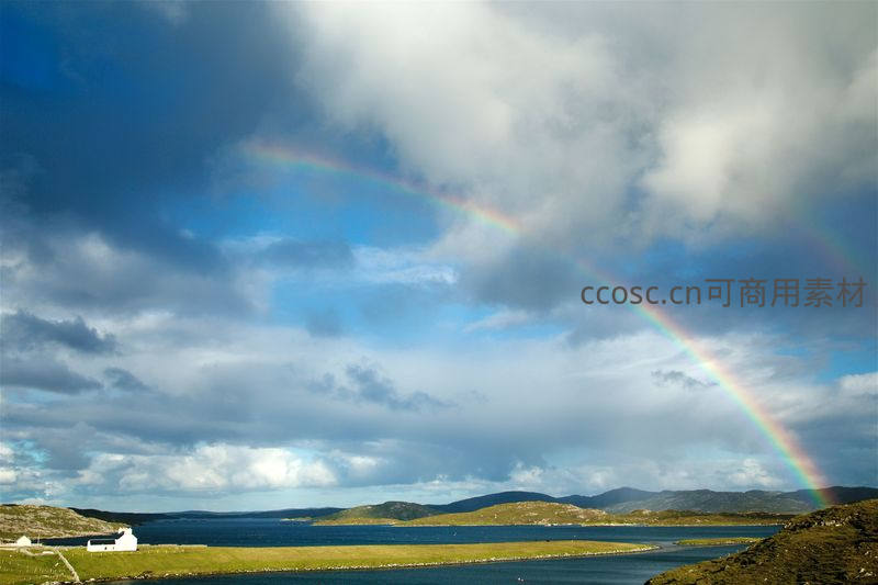 一道绚丽的彩虹横跨在蔚蓝天空与平静湖面之间,远处山峦起伏,近处绿草如茵,景色如画。