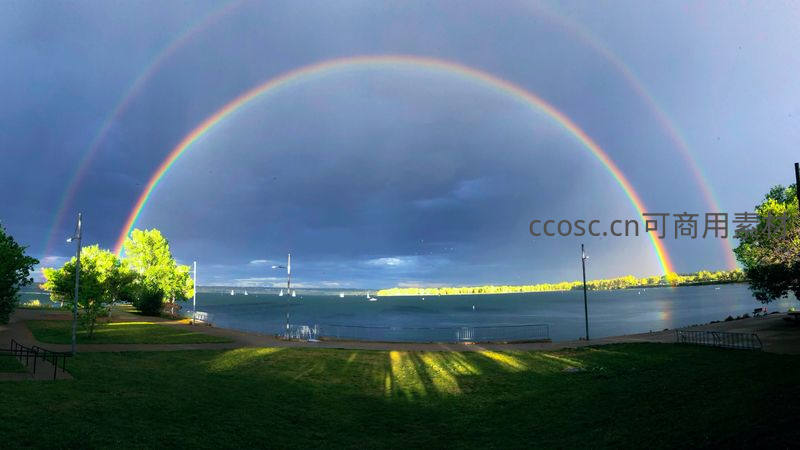 双彩虹笼罩湖畔公园绿地