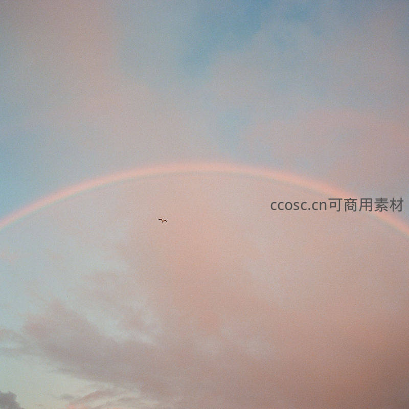 柔和粉橙色云霞弥漫天际,一道淡雅彩虹静静悬挂,一只孤鸟掠过弧顶,画面宁静又充满诗意。