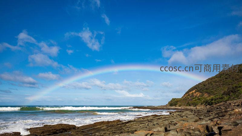 蔚蓝天空下,一道完美的彩虹拱门跨越在波涛汹涌的海面与崎岖的岩石海岸之间,展现了大自然宁静与力量的和谐之美。