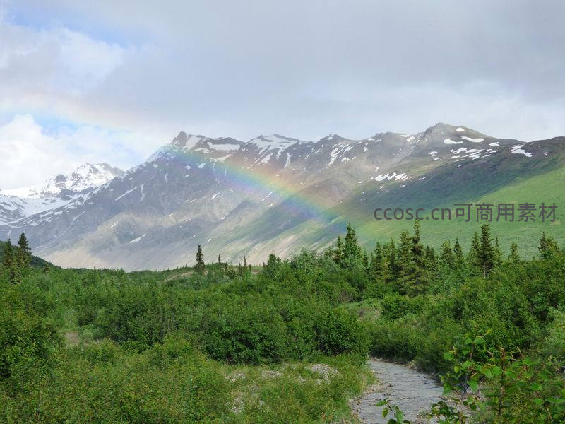 雪山脚下森林小径的彩虹桥