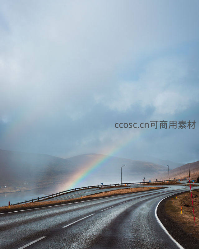 雨后的山间公路上空,一道朦胧的彩虹横跨在连绵起伏的山峦之间,湿润的路面反射着微光,诉说着旅途中的诗意与远方。